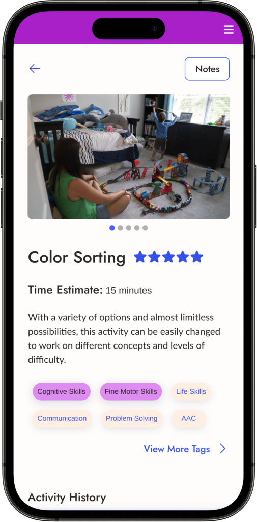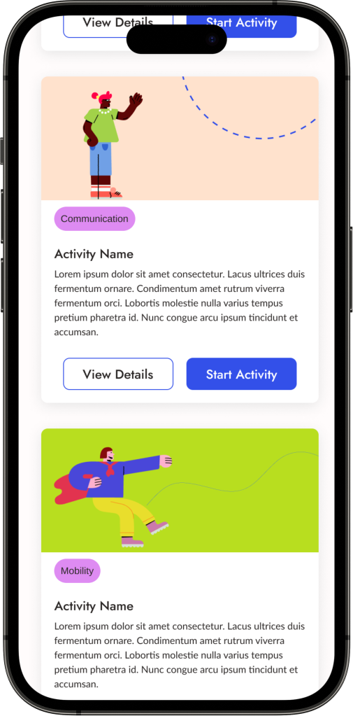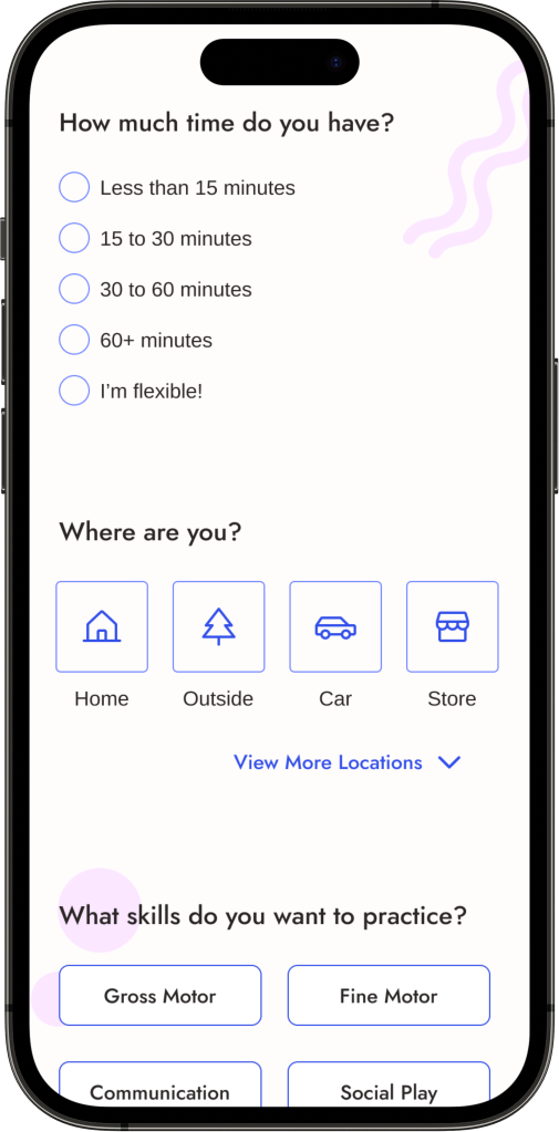 To minimize decision fatigue, the app includes an activity finder feature where caregivers take a very short survey to get matched with an activity based on their answers.