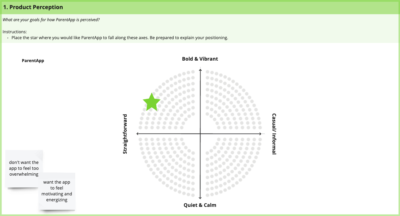 During our kick off call with the team, we had the ParentApp team participate in an UI exercise to determine what aesthetics and adjectives they gravitated towards. This helped me understand what they want to see in their app. Through this exercise, I was able to determine that most of the team leaned towards: